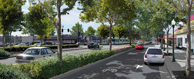 Rendering of a multiway boulevard per the 2010 Walnut Station Special Area Plan. Note the separated local access lane and on-street parking, which are not evident in the Walnut Station roundabout rendering above.
